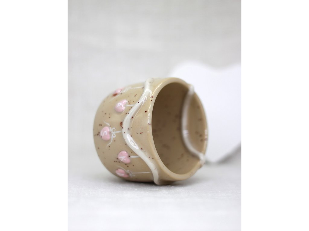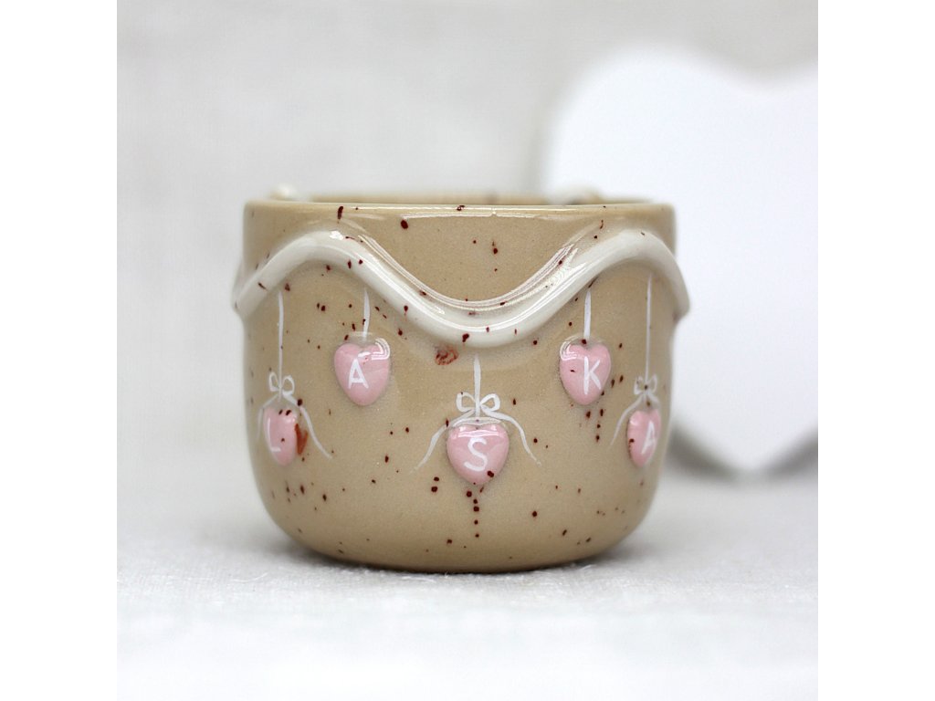 Hrnček je vyrobený zo svetlej kameniny, zdobený ručne modelovanou a engobami farbenou Valentínskou girlandou ozdobenou srdiečkami s nápisom LÁSKA.