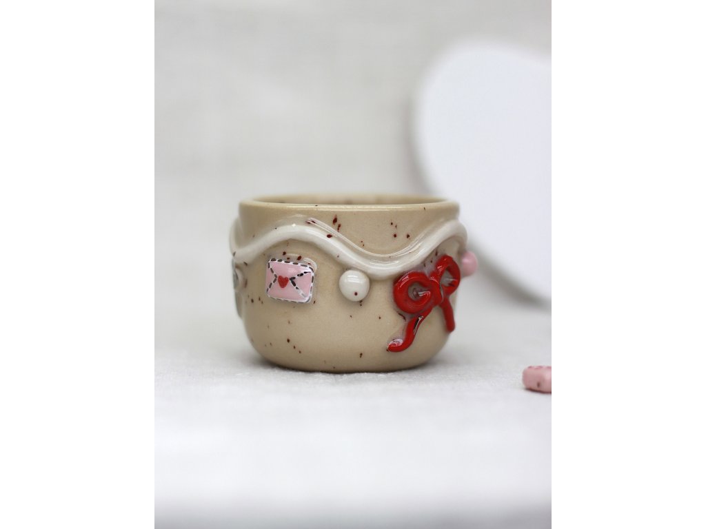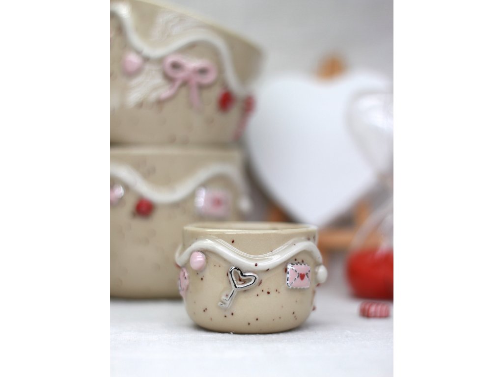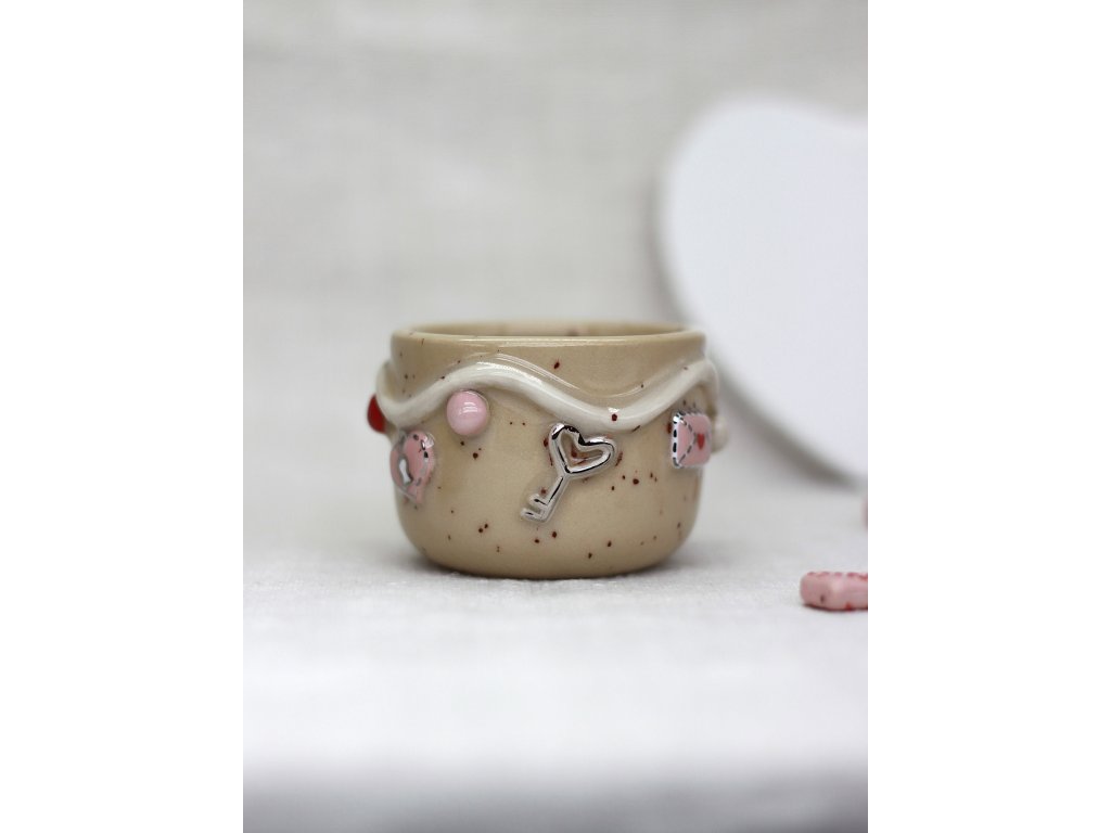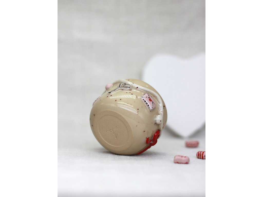 Hrnček je vyrobený zo svetlej kameniny, zdobený ručne modelovanou a engobami farbenou Valentínskou girlandou s ozdobami obálky so srdiečkom, srdiečkovým kľúčom a kladkou. symbolom nekonečna a mašličky. Girlandu zdobia aj platinové detaily, ktoré podčiarkujú krásu každého prvku.