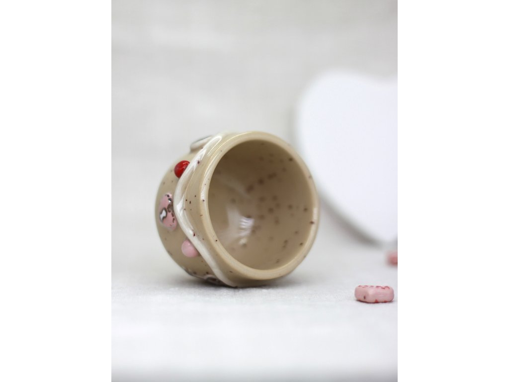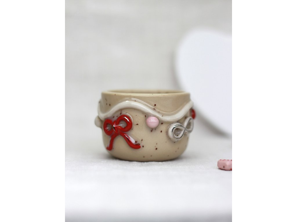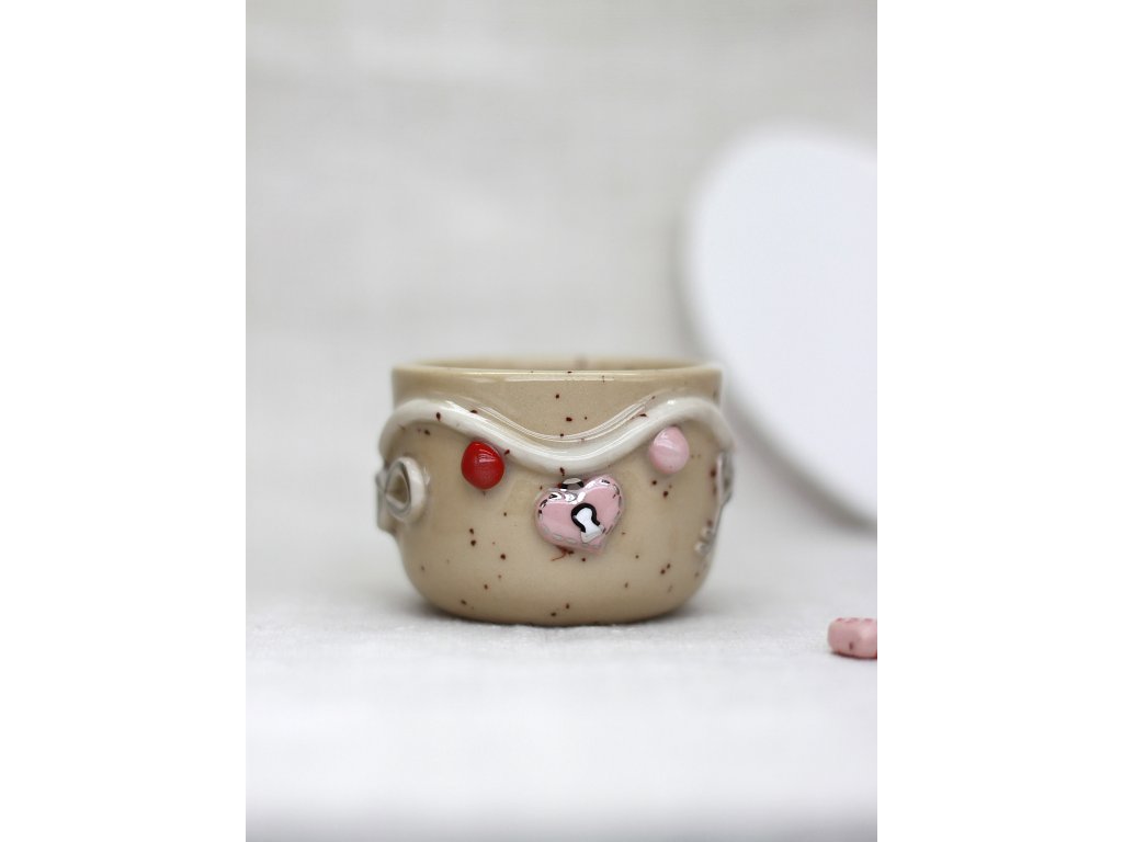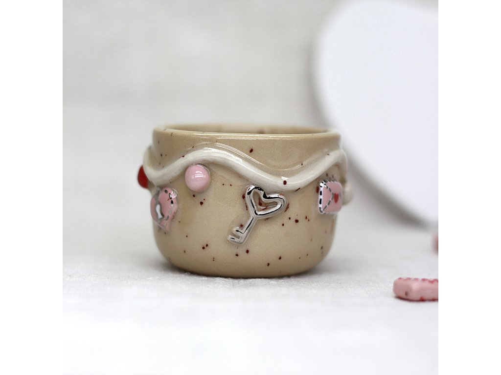 Hrnček je vyrobený zo svetlej kameniny, zdobený ručne modelovanou a engobami farbenou Valentínskou girlandou s ozdobami obálky so srdiečkom, srdiečkovým kľúčom a kladkou. symbolom nekonečna a mašličky. Girlandu zdobia aj platinové detaily, ktoré podčiarkujú krásu každého prvku.