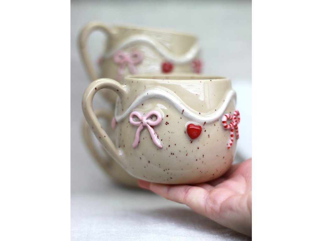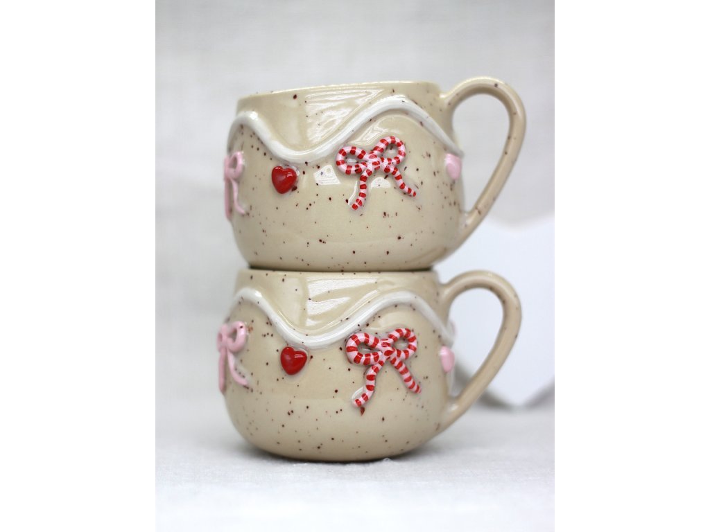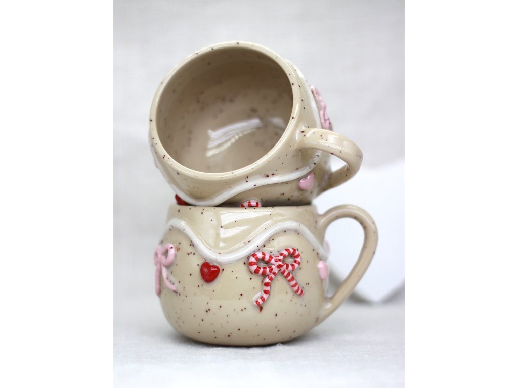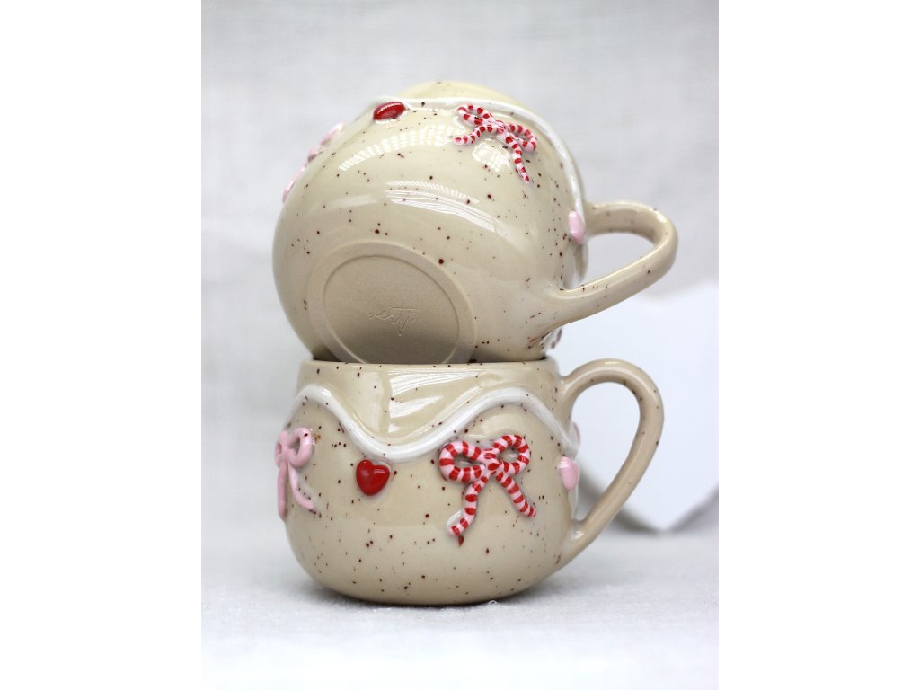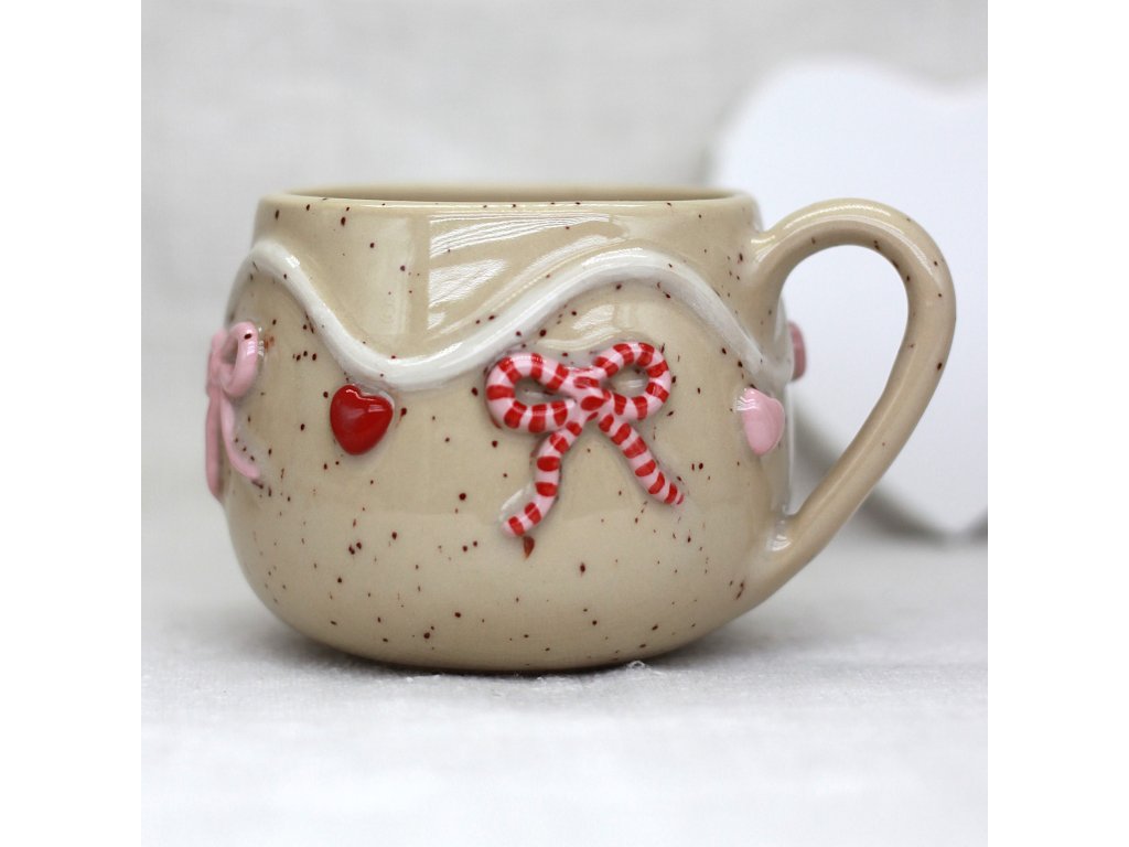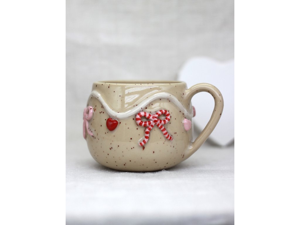 Hrnček je vyrobený zo svetlej kameniny, zdobený ručne modelovanou a engobami farbenou Valentínskou girlandou ozdobenou srdiečkami a mašličkami.